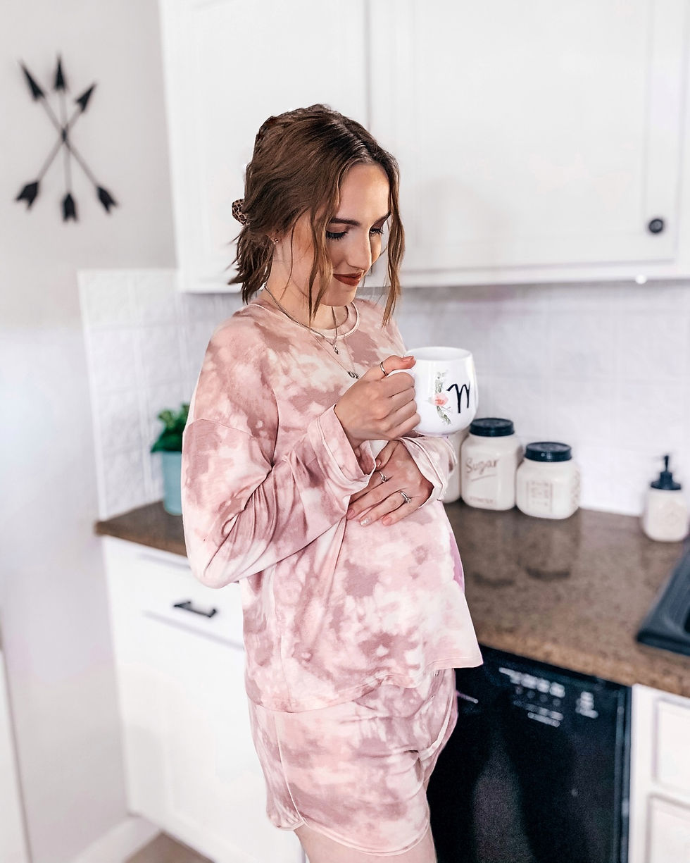 These are the softest, comfiest pink tie dye pjs ever! It comes as a set with the long sleeve top and shorts, and there is also a pair of matching long pj pants and a short nightgown. These run true to size and are not maternity, but are great with a bump. I could live in comfy pajamas...and I often do. ;)